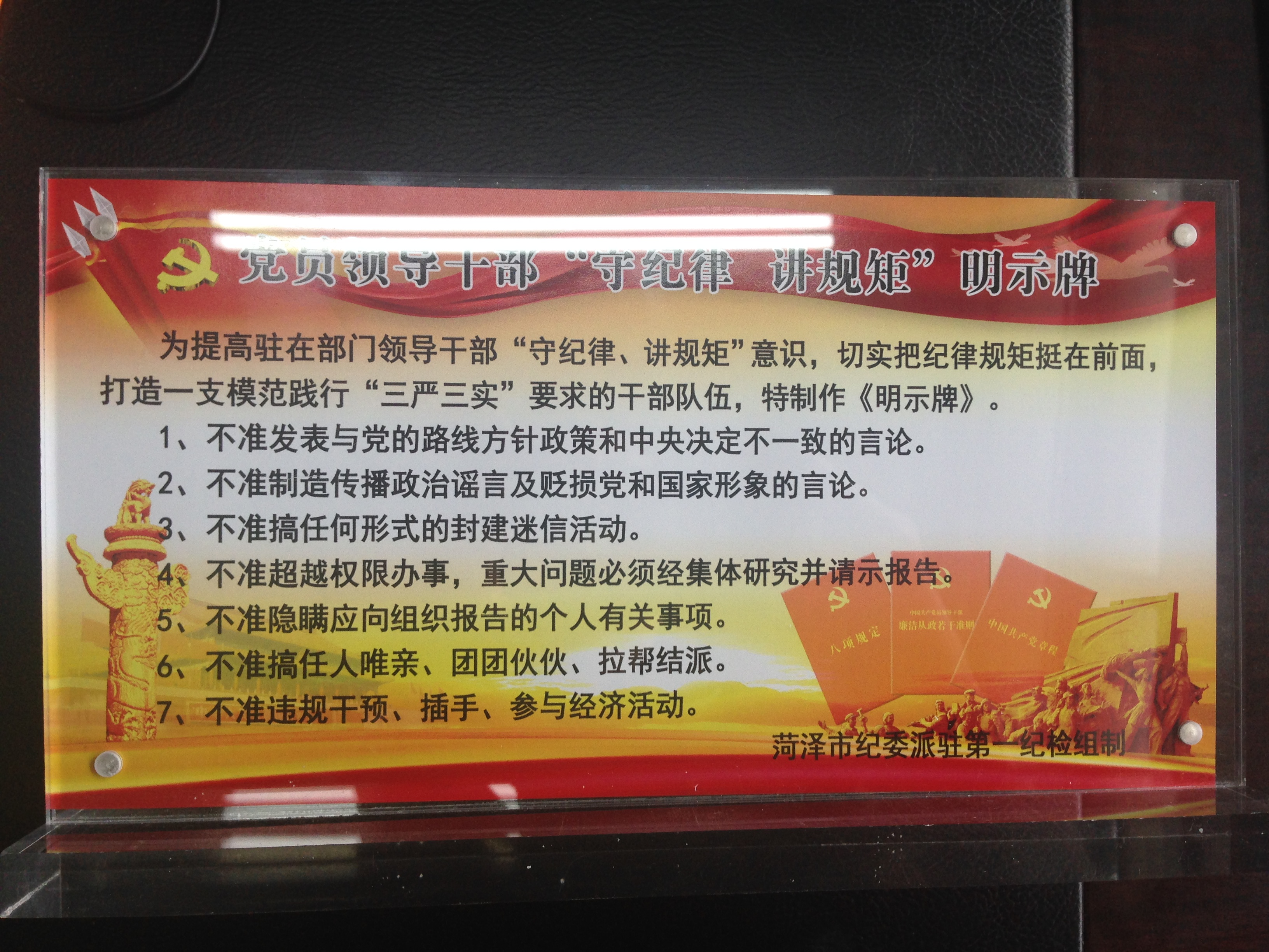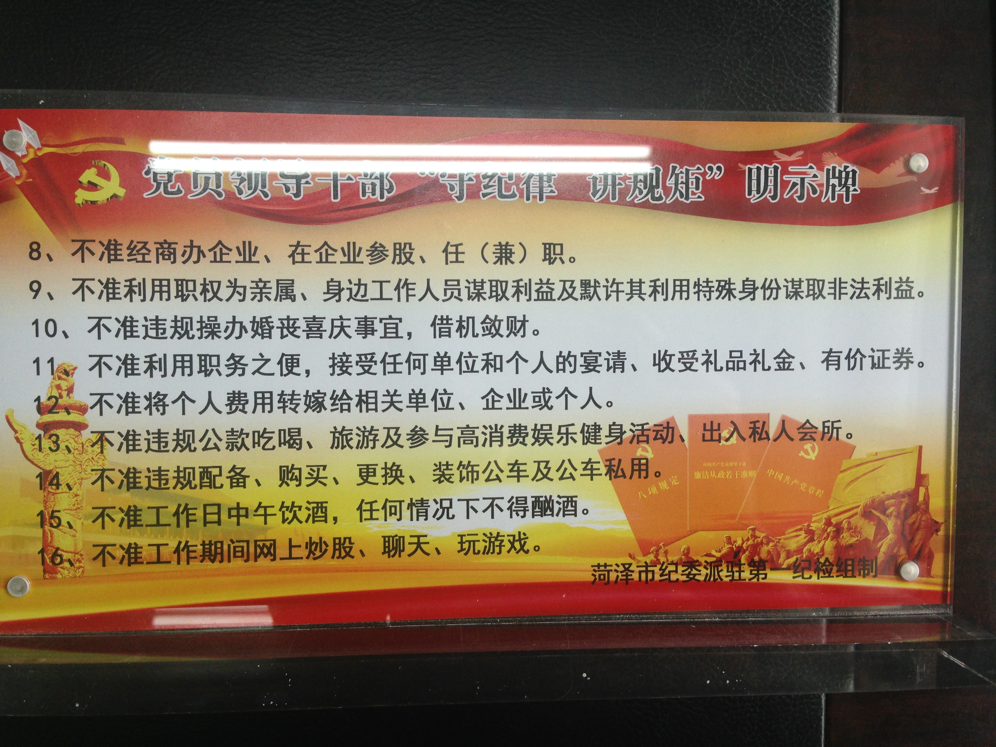 近日,按照菏泽市纪委(监察局)会议精神,菏泽市史志办为党组成员配发党员干部“守纪律、讲规矩”明示牌,明确规定“十六个不准”,并全文学习了《中国共产党党组工作条例(试行)》,部署下一步工作任务,明确思路,增强党员干部纪律意识。