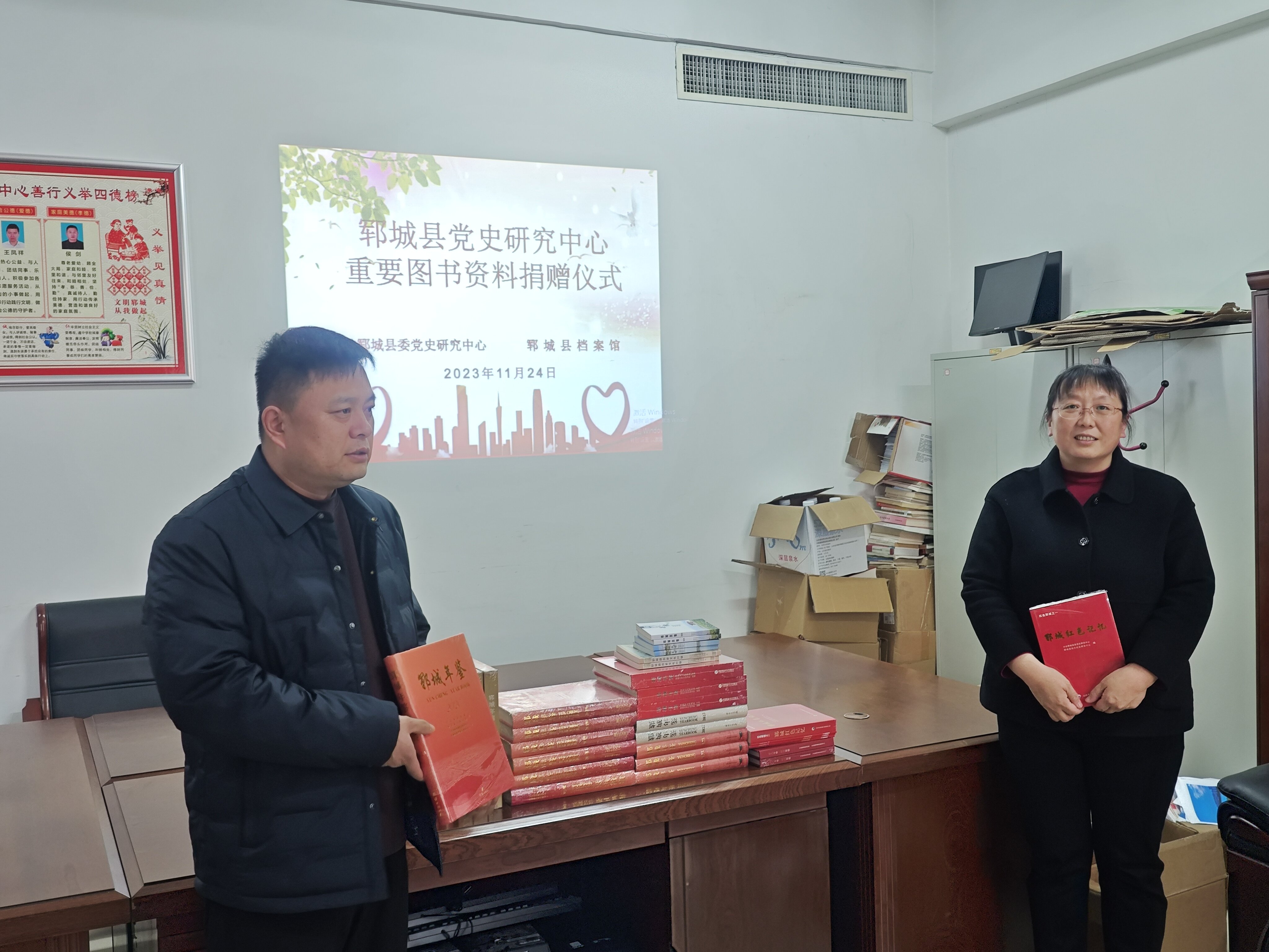为深入贯彻落实党的二十大精神,进一步加强郓城县党史宣传教育工作,11月24日,中共郓城县委党史研究中心向郓城县档案馆捐献《郓城红色记忆》《郓城红色印记》《郓城年鉴》等党史地情书籍80余本,助力建设红色书架。郓城县委党史研究中心主任王琰和档案馆馆长张传庆共同出席捐赠仪式。